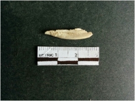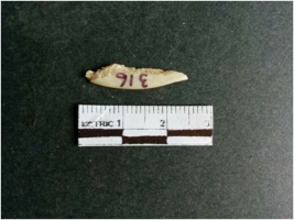 | Description / विवरण | The shell fragment is a small piece, with truncated ends and sharp edges. The piece has natural polish on its inner surface and outer surface has natural rough striations. The piece is pale white in color. The piece is waste material bi - product as a result of shell working at the site. |