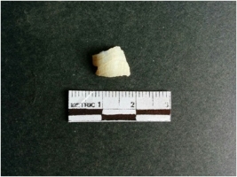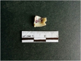 | Description / विवरण | The shell fragment is a small piece, with truncated ends and sharp edges. The piece has natural polish on its inner surface and outer surface has natural rough striations. The piece is pale white in color. The piece is waste material bi - product as a result of shell working at the site. |