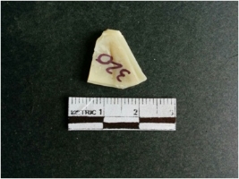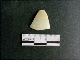 | Description / विवरण | The shell fragment is a small piece, with truncated ends and sharp edges. The piece has natural polish on its inner surface and outer surface has natural rough striations. The piece is pale white in color. The piece is waste material bi - product as a result of shell working at the site. |