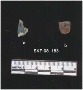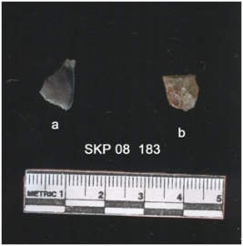 | Description / विवरण | Lithic debitage of chalcedony with ferrous impurities, flaked marks are seen. |