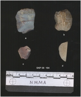 | Description / विवरण | A banded chert stone with ripple on one surface and striking platform is seen. Yellow ocher with bands of dark shades. |