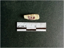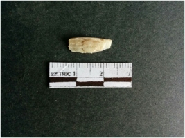 | Description / विवरण | The shell fragment is a small piece, with truncated ends and sharp edges. The piece has natural polish on its inner surface and outer surface has natural rough striations. The piece is pale white in color. The piece is waste material bi - product as a result of shell working at the site. |