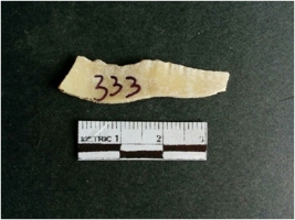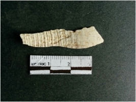 | Description / विवरण | The shell fragment is a small piece, with truncated ends and sharp edges. The piece has natural polish on its inner surface and outer surface has natural rough striations. The piece is pale white in color. The piece is waste material bi - product as a result of shell working at the site. |