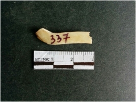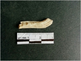 | Description / विवरण | The shell fragment is a small piece, with truncated ends and sharp edges. The piece has natural polish on its inner surface and outer surface has natural rough striations. The piece is pale white in color. The piece is waste material bi - product as a result of shell working at the site. |