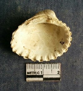 | Description / विवरण | The shell piece is pale white in color. It has surface striations on account of its natural formation. The piece has cut edges with angular points and some surface aberration. The piece is a by product of shell object making process. |