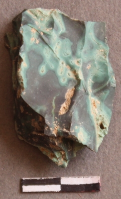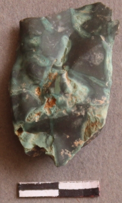 | Description / विवरण | This is waste fragment of jasper stone with cut ridges and bulb of percussion. Lots of copper impurities both internally are forming a patchy surface. |
