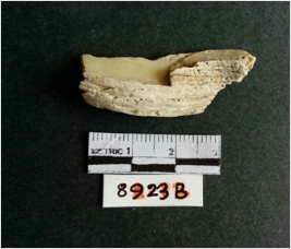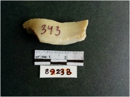 | Description / विवरण | The shell fragment is a small piece, with truncated ends and sharp edges. The piece has natural polish on its inner surface and outer surface has natural rough striations. The piece is pale white in color. The piece is waste material bi - product as a result of shell working at the site. |