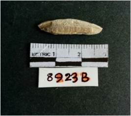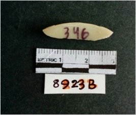| Description / विवरण | The shell fragment is a small piece, with truncated ends and sharp edges. The piece has natural polish on its inner surface and outer surface has natural rough striations. The piece is pale white in color. The piece is waste material bi - product as a result of shell working at the site. |