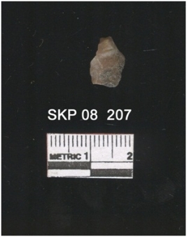 | Description / विवरण | A small fragment of chert stone. A primary flake with impurities and flaked ridges. |