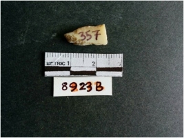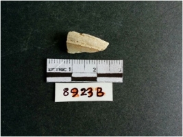 | Description / विवरण | The shell fragment is a small piece, with truncated ends and sharp edges. The piece has natural polish on its inner surface and outer surface has natural rough striations. The piece is pale white in color. The piece is waste material bi - product as a result of shell working at the site. |