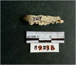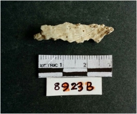 | Description / विवरण | The shell fragment is a small piece, with truncated ends and sharp edges. The piece has natural polish on its inner surface and outer surface has natural rough striations. The piece is pale white in color. The piece is waste material bi - product as a result of shell working at the site. |