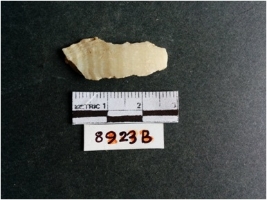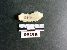 | Description / विवरण | The shell fragment is a small piece, with truncated ends and sharp edges. The piece has natural polish on its inner surface and outer surface has natural rough striations. The piece is pale white in color. The piece is waste material bi - product as a result of shell working at the site. |