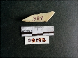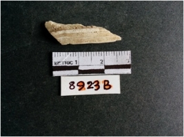 | Description / विवरण | The shell fragment is a small piece, with truncated ends and sharp edges. The piece has natural polish on its inner surface and outer surface has natural rough striations. The piece is pale white in color. The piece is waste material bi - product as a result of shell working at the site. |