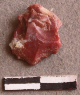 | Description / विवरण | Jasper stone fragment with bulb of percussion, pinkish in color and with a white irregular band formation. |