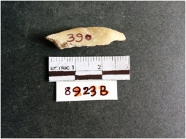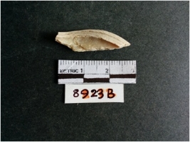 | Description / विवरण | The shell fragment is a small piece, with truncated ends and sharp edges. The piece has natural polish on its inner surface and outer surface has natural rough striations. The piece is pale white in color. The piece is waste material bi - product as a result of shell working at the site. |