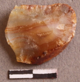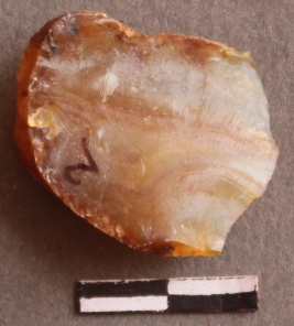 | Description / विवरण | Chalcedony with bend, bulb of percussion and cortex, transparent. |