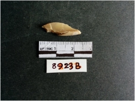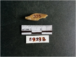 | Description / विवरण | The shell fragment is a small piece, with truncated ends and sharp edges. The piece has natural polish on its inner surface and outer surface has natural rough striations. The piece is pale white in color. The piece is waste material bi - product as a result of shell working at the site. |