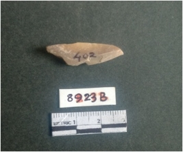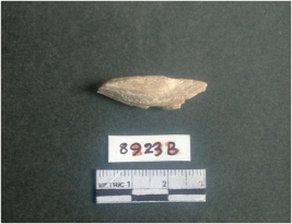 | Description / विवरण | The shell fragment is a small piece, with truncated ends and sharp edges. The piece has natural polish on its inner surface and outer surface has natural rough striations. The piece is pale white in color. The piece is waste material bi - product as a result of shell working at the site. |