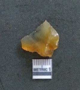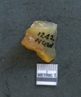 | Description / विवरण | It is a chalcedony flake with a bulb of percussion on the ventral side, cortex on one end. |