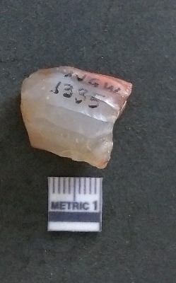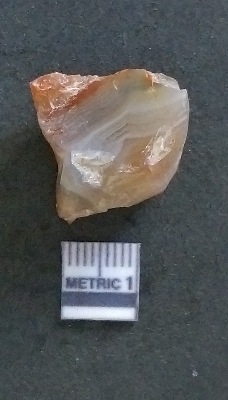 | Description / विवरण | It is a chalcedony flake with a bulb of percussion on the ventral side, cortex on one end. |