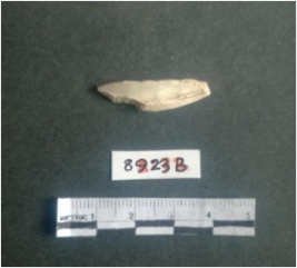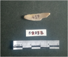 | Description / विवरण | The shell fragment is a small piece, with truncated ends and sharp edges. The piece has natural polish on its inner surface and outer surface has natural rough striations. The piece is pale white in color. The piece is waste material bi - product as a result of shell working at the site. |