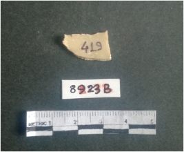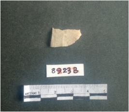 | Description / विवरण | The shell fragment is a small piece, with truncated ends and sharp edges. The piece has natural polish on its inner surface and outer surface has natural rough striations. The piece is pale white in color. The piece is waste material bi - product as a result of shell working at the site. |