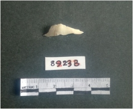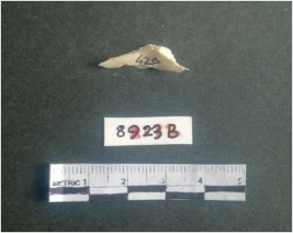 | Description / विवरण | The shell fragment is a small piece, with truncated ends and sharp edges. The piece has natural polish on its inner surface and outer surface has natural rough striations. The piece is pale white in color. The piece is waste material bi - product as a result of shell working at the site. |