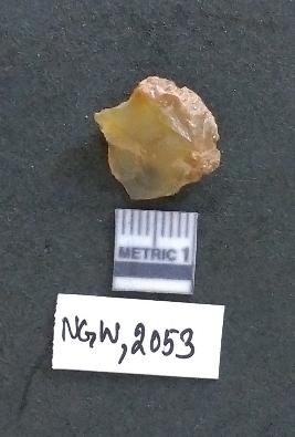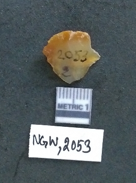 | Description / विवरण | It is a chalcedony flake with a bulb of percussion on the ventral side, cortex on one end. |
