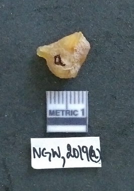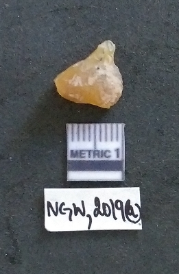 | Description / विवरण | It is a chalcedony flake with a bulb of percussion on the ventral side, cortex on one end. |