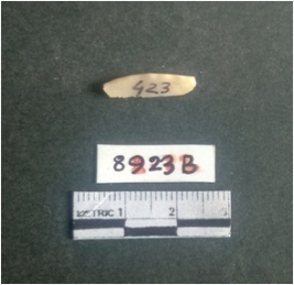 | Description / विवरण | The shell fragment is a small piece, with truncated ends and sharp edges. The piece has natural polish on its inner surface and outer surface has natural rough striations. The piece is pale white in color. The piece is waste material bi - product as a result of shell working at the site. |