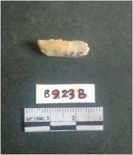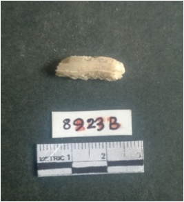 | Description / विवरण | The shell fragment is a small piece, with truncated ends and sharp edges. The piece has natural polish on its inner surface and outer surface has natural rough striations. The piece is pale white in color. The piece is waste material bi - product as a result of shell working at the site. |