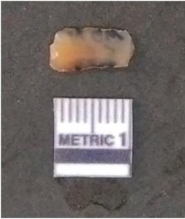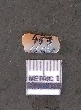 | Description / विवरण | It is a chalcedony flake with a bulb of percussion on the ventral side, cortex on one end. |