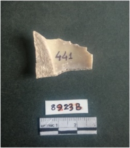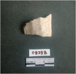 | Description / विवरण | The shell fragment is a small piece, with truncated ends and sharp edges. The piece has natural polish on its inner surface and outer surface has natural rough striations. The piece is pale white in color. The piece is waste material bi - product as a result of shell working at the site. |