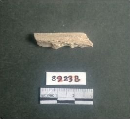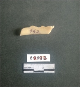 | Description / विवरण | The shell fragment is a small piece, with truncated ends and sharp edges. The piece has natural polish on its inner surface and outer surface has natural rough striations. The piece is pale white in color. The piece is waste material bi - product as a result of shell working at the site. |
