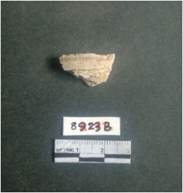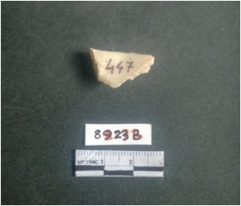 | Description / विवरण | The shell fragment is a small piece, with truncated ends and sharp edges. The piece has natural polish on its inner surface and outer surface has natural rough striations. The piece is pale white in color. The piece is waste material bi - product as a result of shell working at the site. |