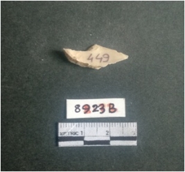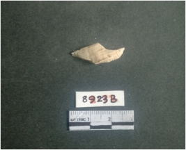 | Description / विवरण | The shell fragment is a small piece, with truncated ends and sharp edges. The piece has natural polish on its inner surface and outer surface has natural rough striations. The piece is pale white in color. The piece is waste material bi - product as a result of shell working at the site. |