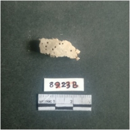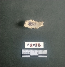 | Description / विवरण | The shell fragment is a small piece, with truncated ends and sharp edges. The piece has natural polish on its inner surface and outer surface has natural rough striations. The piece is pale white in color. The piece is waste material bi - product as a result of shell working at the site. |