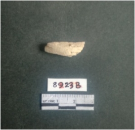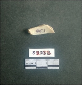 | Description / विवरण | The shell fragment is a small piece, with truncated ends and sharp edges. The piece has natural polish on its inner surface and outer surface has natural rough striations. The piece is pale white in color. The piece is waste material bi - product as a result of shell working at the site. |