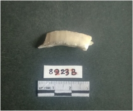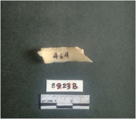 | Description / विवरण | The shell fragment is a small piece, with truncated ends and sharp edges. The piece has natural polish on its inner surface and outer surface has natural rough striations. The piece is pale white in color. The piece is waste material bi - product as a result of shell working at the site. |