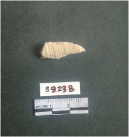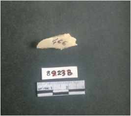| Description / विवरण | The shell fragment is a small piece, with truncated ends and sharp edges. The piece has natural polish on its inner surface and outer surface has natural rough striations. The piece is pale white in color. The piece is waste material bi - product as a result of shell working at the site. |