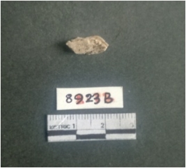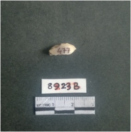 | Description / विवरण | The shell fragment is a small piece, with truncated ends and sharp edges. The piece has natural polish on its inner surface and outer surface has natural rough striations. The piece is pale white in color. The piece is waste material bi - product as a result of shell working at the site. |