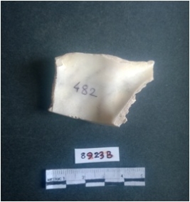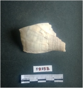 | Description / विवरण | The shell fragment is a small piece, with truncated ends and sharp edges. The piece has natural polish on its inner surface and outer surface has natural rough striations. The piece is pale white in color. The piece is waste material bi - product as a result of shell working at the site. |