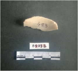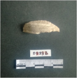 | Description / विवरण | The shell fragment is a small piece, with truncated ends and sharp edges. The piece has natural polish on its inner surface and outer surface has natural rough striations. The piece is pale white in color. The piece is waste material bi - product as a result of shell working at the site. |