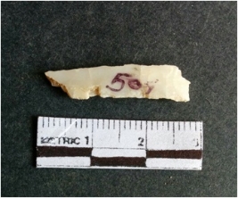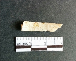 | Description / विवरण | The shell fragment is a small piece, with truncated ends and sharp edges. The piece has natural polish on its inner surface and outer surface has natural rough striations. The piece is pale white in color. The piece is waste material bi - product as a result of shell working at the site. |