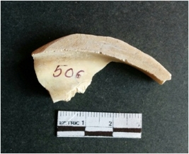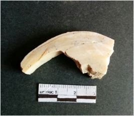 | Description / विवरण | The shell fragment is a small piece, with truncated ends and sharp edges. The piece has natural polish on its inner surface and outer surface has natural rough striations. The piece is pale white in color. The piece is waste material bi - product as a result of shell working at the site. |