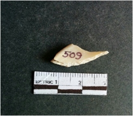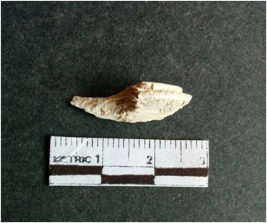 | Description / विवरण | The shell fragment is a small piece, with truncated ends and sharp edges. The piece has natural polish on its inner surface and outer surface has natural rough striations. The piece is pale white in color. The piece is waste material bi - product as a result of shell working at the site. |