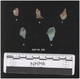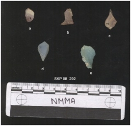 | Description / विवरण | Broken chert flake, turquoise blue in color. Edges are rough, one side is smoother. |
