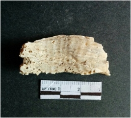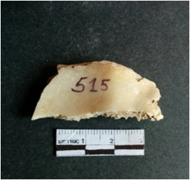 | Description / विवरण | The shell fragment is a small piece, with truncated ends and sharp edges. The piece has natural polish on its inner surface and outer surface has natural rough striations. The piece is pale white in color. The piece is waste material bi - product as a result of shell working at the site. |