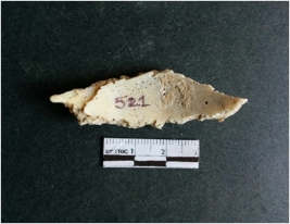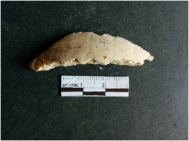 | Description / विवरण | The shell fragment is a small piece, with truncated ends and sharp edges. The piece has natural polish on its inner surface and outer surface has natural rough striations. The piece is pale white in color. The piece is waste material bi - product as a result of shell working at the site. |