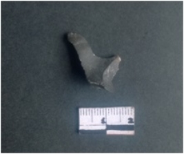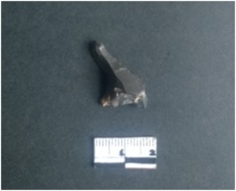 | Description / विवरण | This is a chert stone flake, one side tappered to a pointed end. Uneven cut ridges with a negative bulb of percussion and ripples. The tappered portion is retouched and has denticulated marks on one side margin. |
